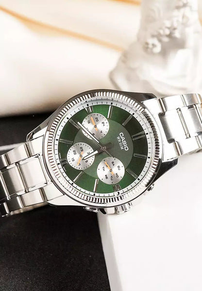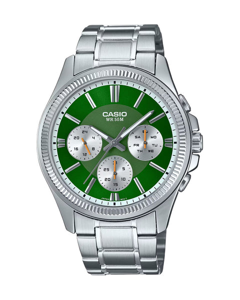 Expertly crafted with a stainless steel band and ion plated case, the Casio MTP-1375D-3AVDF Men's Metal Band Multifunction Green Dial Watch is durable and stylish. With a 50-meter water resistance and mineral glass, this watch is built to last. Plus, enjoy precise timekeeping with an accuracy of ±20 seconds per month and a 3-year battery life.