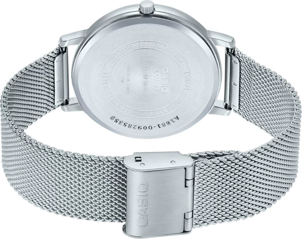 A simple and clean face is offset by a slit date window running from 3 o’clock to 9 o’clock, and a slit day window that runs from 5 o’clock to 7 o’clock. The red of the hands and display markings of this model provide attractive accents to the minimalist designs. 50-meter water resistance provides plenty of protection for everyday use, whether at work or at play. MTP-B105M has a fashionable, easy-to-adjust mesh band.