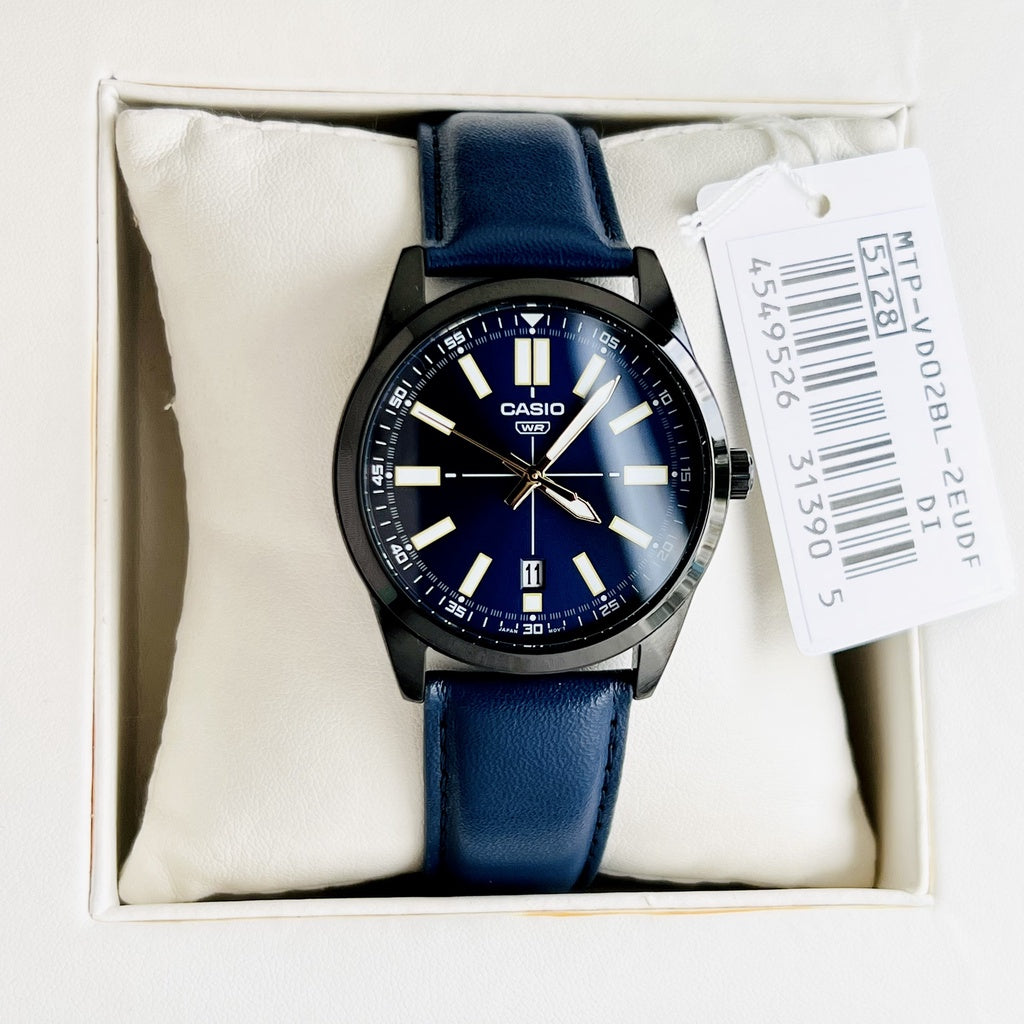 Casio MTP-VD02BL-2EUDF watch is a minimalist analog design that features a handy date display at the 6 o’clock position. Water resistance for daily use frees you from worry when washing up.