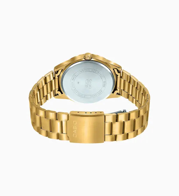 Stainless Steel Band Triple-fold Clasp Mineral Glass Gold ion plated band Gold ion plated case Water Resistant Date display Regular timekeeping Analog: 3 hands (hour, minute, second) Accuracy: ±20 seconds per month
