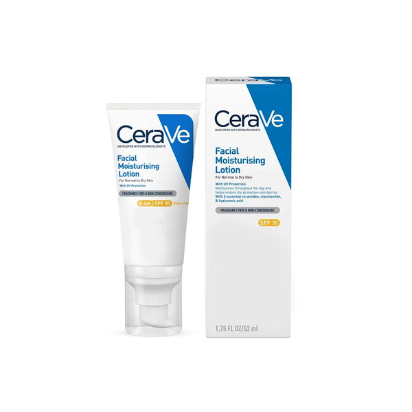 CeraVe Facial Moisturizing Lotion SPF 30 (52ml) offers advanced hydration and broad-spectrum sun protection in one step. Developed with dermatologists, this AM moisturizer is formulated with three essential ceramides, niacinamide, and hyaluronic acid to strengthen the skin’s barrier, calm irritation, and retain moisture throughout the day.