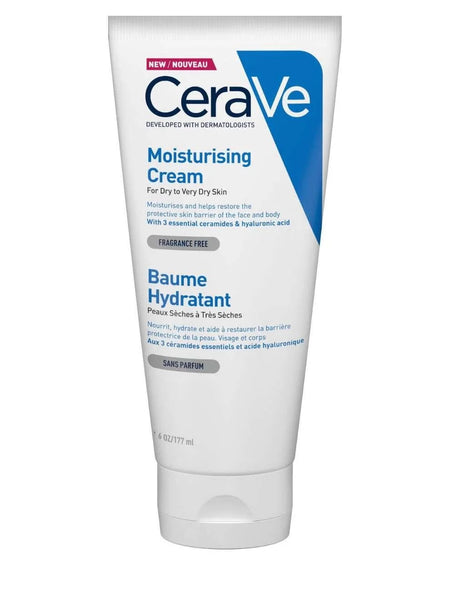 CeraVe Moisturising Cream delivers 24-hour hydration through its patented MVE technology, which gradually releases ceramides to restore and maintain the skin barrier. Formulated with three essential ceramides and hyaluronic acid, this non-greasy, fragrance-free cream effectively treats dry to very dry skin while being suitable for sensitive skin conditions including eczema. Dermatologist-developed for face and body application.