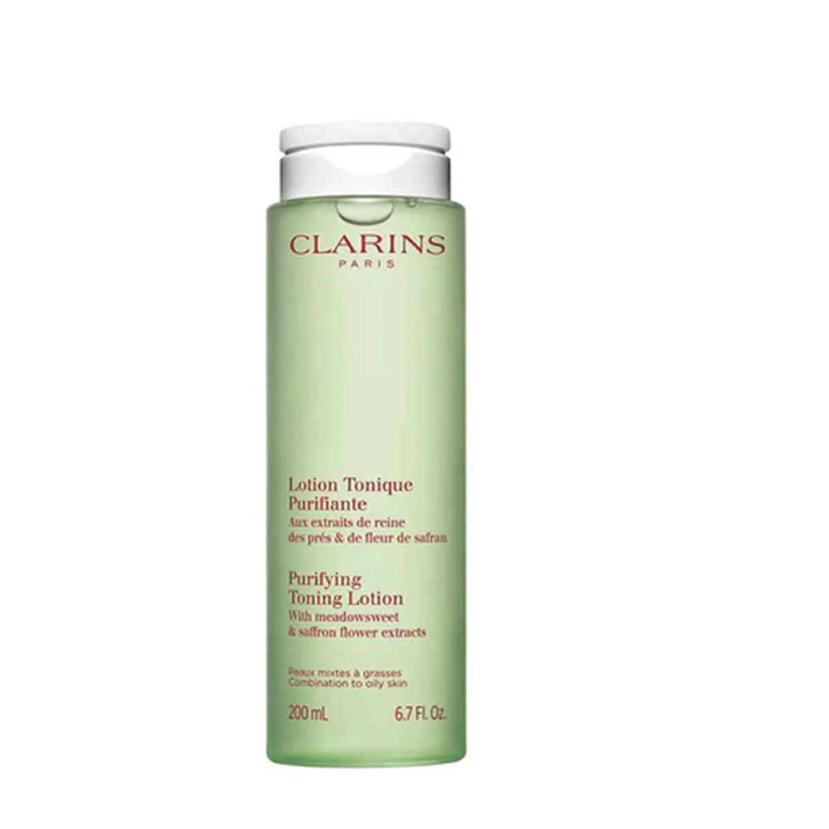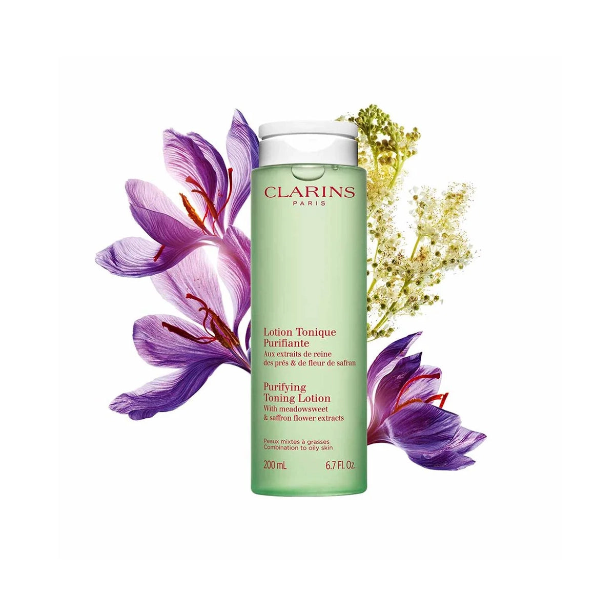 Clarins Purifying Toning Lotion is a refreshing, plant-based, colorant- and alcohol-free face toner—with Witch Hazel and Organic Meadowsweet extracts—gently tones and hydrates combination to oily skin leaving it soft, shine-free, and refined.