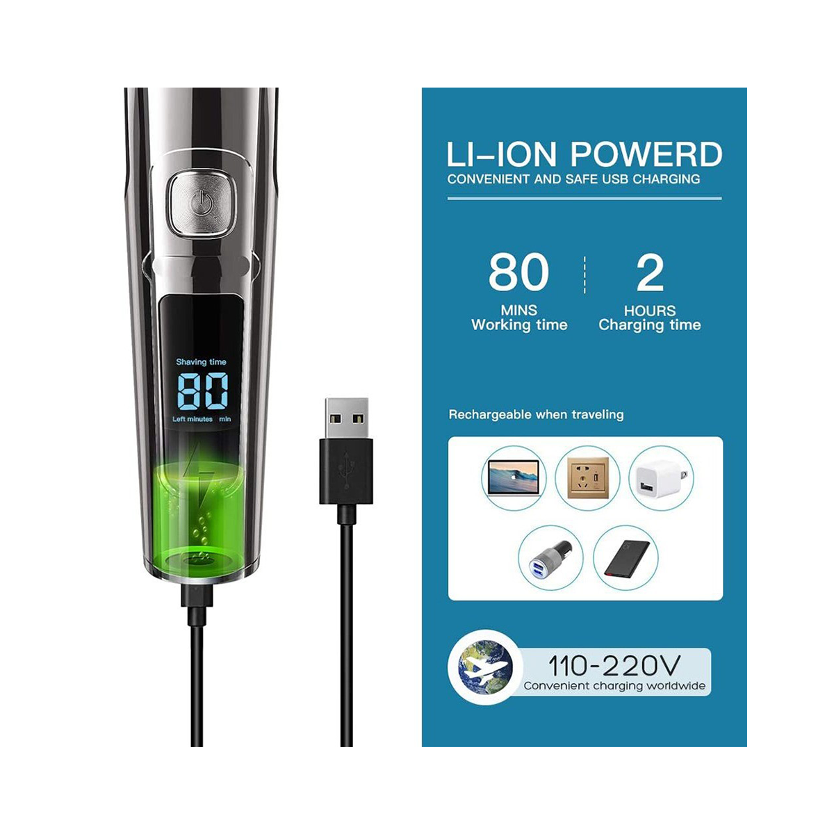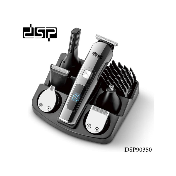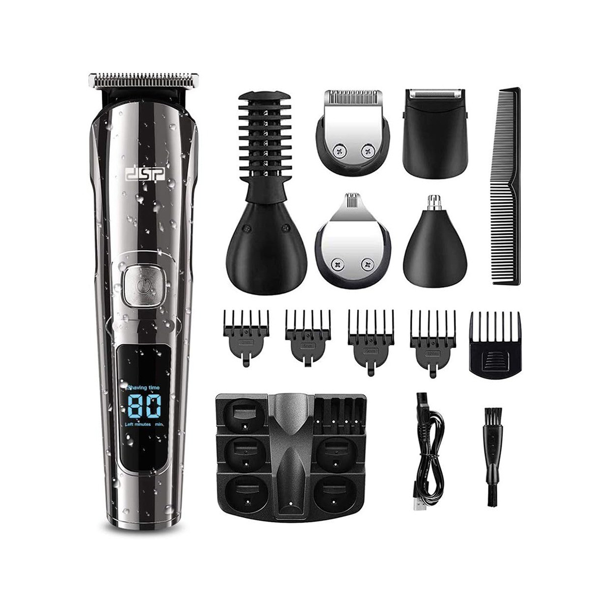 DSP Mens grooming kit includes T-shaped knife, U-shaped knife, nose hair trimmer, electric shaver, precision trimmer, cleaning brush, USB charging cable, limit comb(3-12mm / 1/2/3/4mm adjustable comb) and storage box.