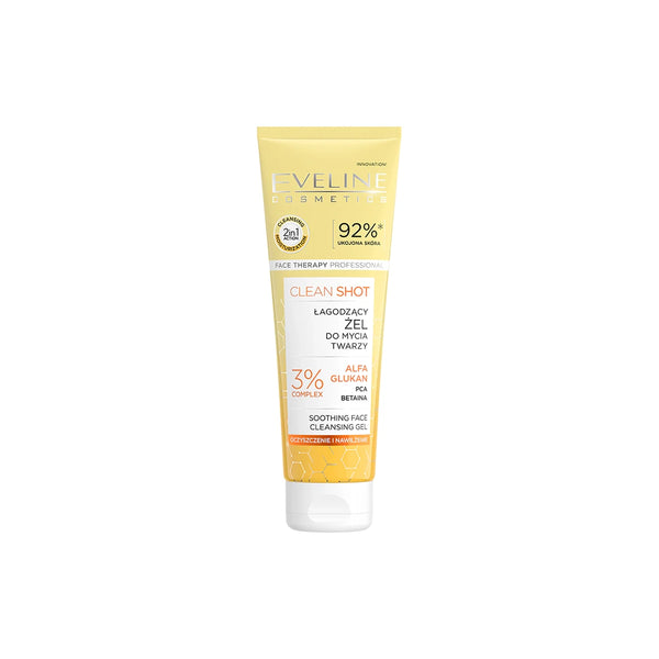 EVELINE Clean Shot Soothing Face Cleansing Gel is a 140ml formula engineered to cleanse effectively while calming and comforting sensitive or reactive skin. This expert-grade gel combines gentle cleansing agents with soothing botanical actives to remove makeup and impurities without triggering irritation or inflammation. The lightweight gel texture provides thorough cleansing while the specialized complex reduces redness and promotes skin comfort. Ideal for sensitive, irritated, or post-procedure skin, this cleanser supports barrier health and resilience. Apply to damp skin morning and evening, massage gently, and rinse thoroughly. Experience clean, calm, and visibly soothed skin with reduced sensitivity, enhanced comfort, and a healthy, balanced complexion free from irritation.