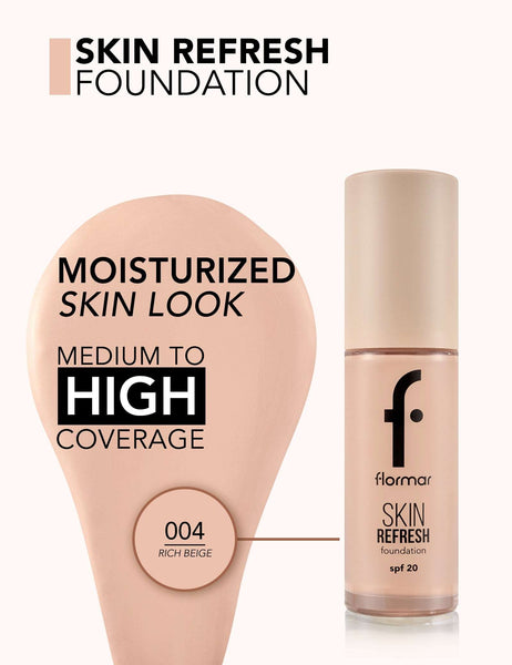 Flormar Skin Refresh SPF 20 Foundation is a thin and liquid textured, comfortable and long-lasting foundation with a natural finish, warm undertone, moisturizing effect, high color pigments and plant-derived extracts, and an illuminating effect suitable for all skin types.