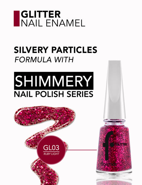 Shimmering nails. Specially designed Glitter Nail Enamel contains nacres in different sizes and textures. Thus, it provides intense and colorful glitter. Long-lasting Flormar nail polish will provide your hands with a brand new charm. When you apply a nail primer underneath, you can achieve even better results. HOW TO APPLY: Apply one coat to clean, dry nails and over a base coat. Allow drying. Apply a second coat wait 2 minutes and apply the Top...