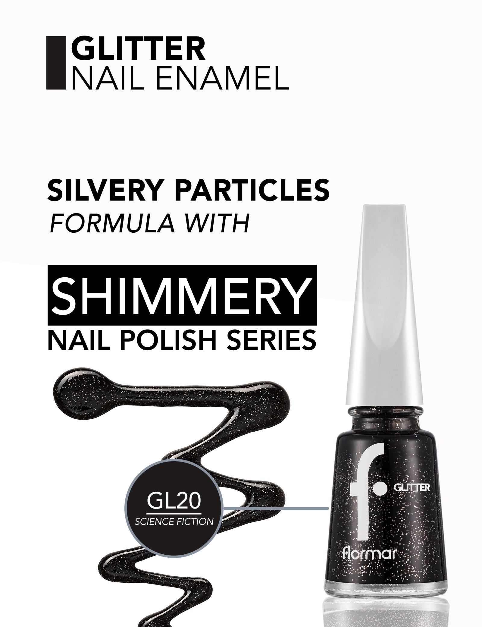 Shimmering nails. Specially designed Glitter Nail Enamel contains nacres in different sizes and textures. Thus, it provides intense and colorful glitter. Long-lasting Flormar nail polish will provide your hands with a brand new charm. When you apply a nail primer underneath, you can achieve even better results.