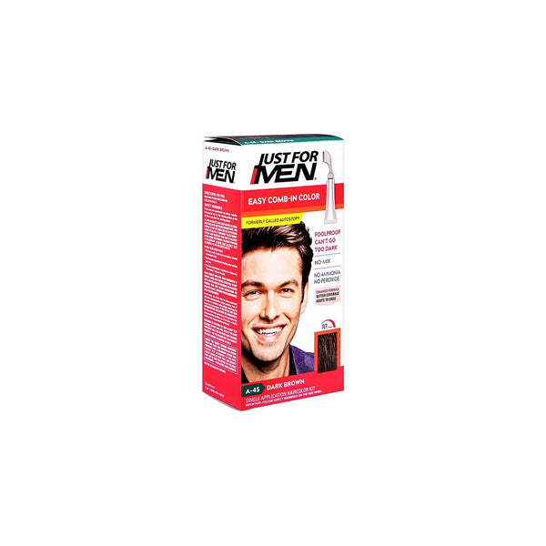 Effortlessly cover gray hair with JUST FOR MEN COLOR EASY COMB DARK BROWN. This foolproof system is designed specifically for men, delivering natural-looking color in minutes. Say goodbye to grays and hello to a youthful, confident appearance with JUST FOR MEN.