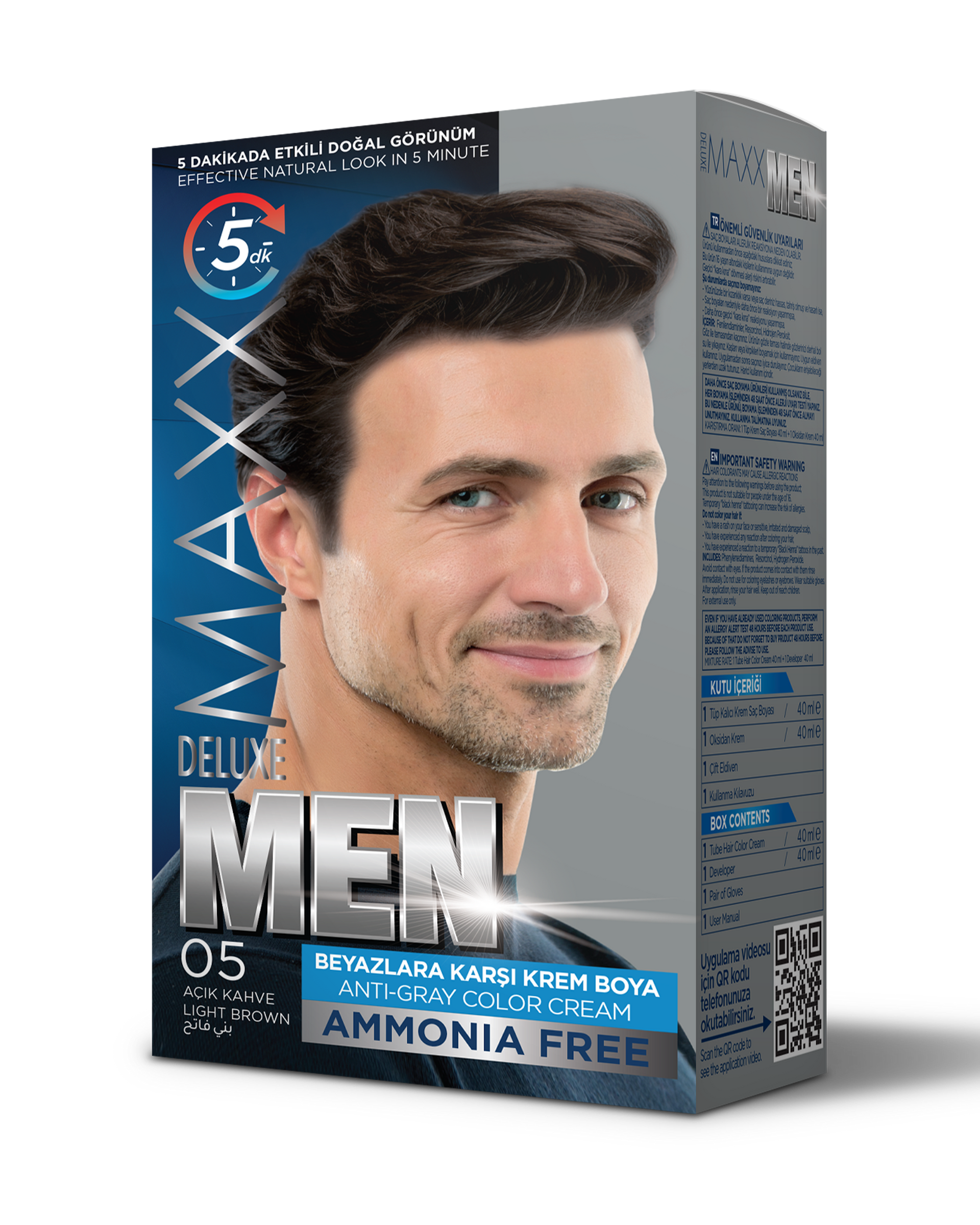 Anti-gray dye; For a natural beautiful color; Quick and easy to use;Maxx Deluxe hair dye for men. Effectively covers gray hair. Provides the most natural look. Colors hair in 5 minutes. Maxx Deluxe Ammonia Free  set dye ensures better penetration of the color into your hair, thanks to its permanent color pigments and color-preserving actives. It perfectly covers your whites.