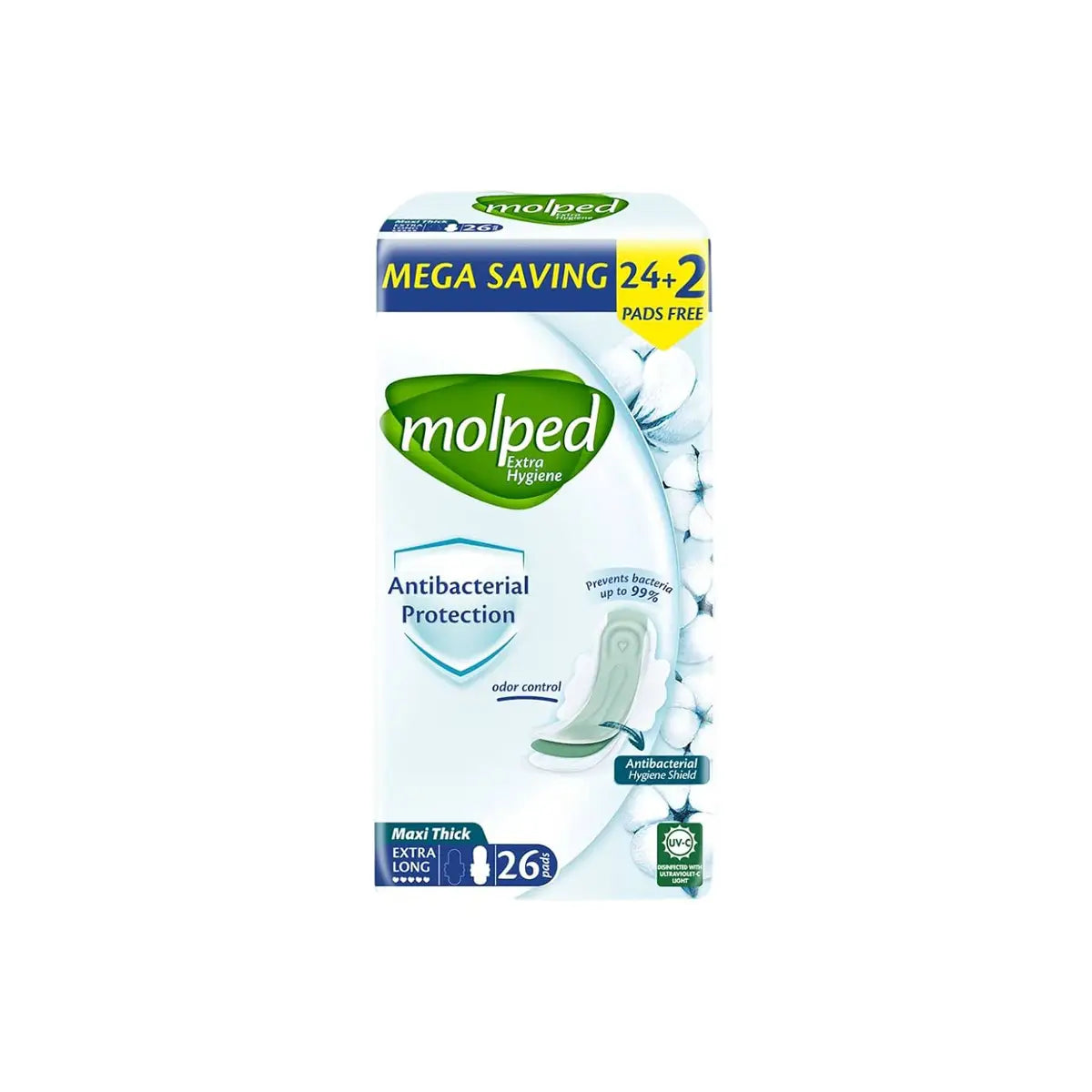 Introducing MOLPED MAXI THICK EXTRA LONG PADS 26S - the ultimate solution for heavy flow days. With its extra long and thick design, these pads provide maximum protection and comfort, giving you peace of mind all day long. Trust in the industry expertise and scientific design of Molped for a worry-free period.