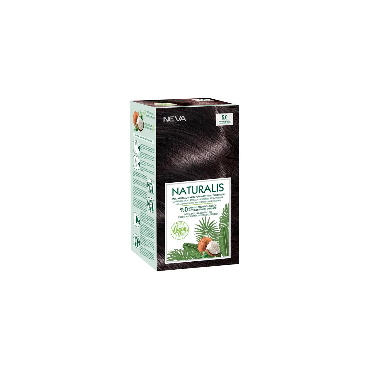 Neva Naturalis Hair Color 5.0 provides 100% grey coverage and intense, long-lasting color. This natural hair color is enriched with nourishing ingredients that leave your hair silky and healthy. Achieve a professional salon-quality result at home with Neva Naturalis Hair Color 5.0.