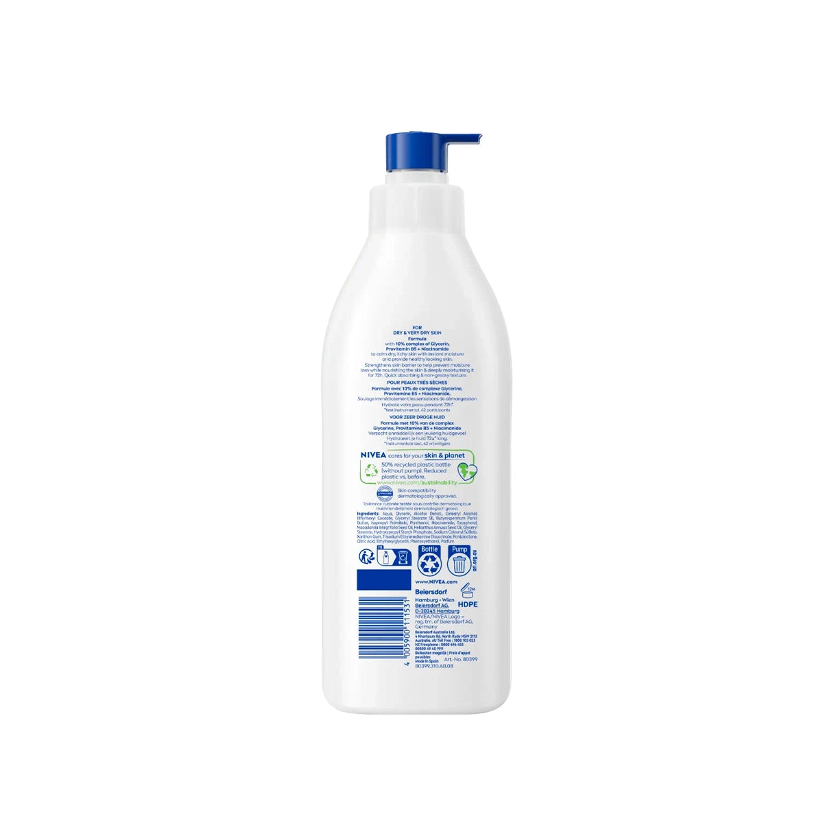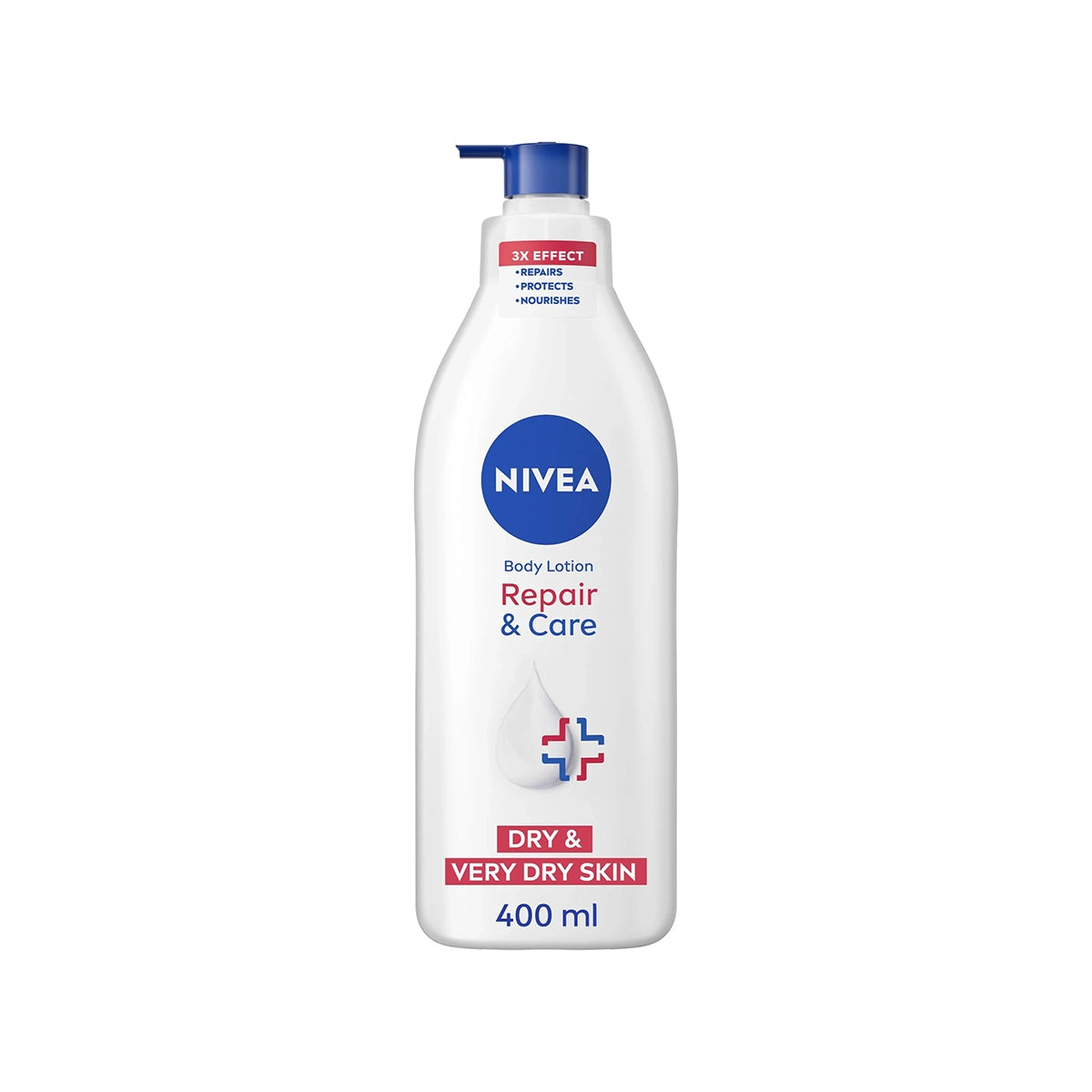NIVEA Body Lotion Repair & Care is a 400ml formula engineered to restore and maintain healthy body skin through comprehensive repair and nourishment. This expert-formulated lotion combines intensive moisturizing actives with skin-repairing compounds to address dryness, damage, and loss of comfort. The rich yet lightweight texture absorbs efficiently, providing long-lasting hydration while supporting the skin barrier's natural repair processes. The advanced complex works to restore suppleness, improve texture, and enhance overall skin resilience and health. Ideal for all body skin types, particularly dry or compromised skin, this lotion delivers visible improvement with consistent use. Apply to clean, damp skin morning and evening for optimal results. Experience visibly restored, deeply nourished, and remarkably soft body skin with enhanced barrier function, improved comfort, and a healthy, radiant appearance.
