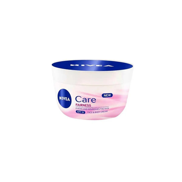 Nivea Care Fairness Creame offers SPF 15 protection in a 100ml bottle. Hydrates and moisturizes skin while reducing dark spots and promoting even skin tone. Dermatologically approved for all skin types.