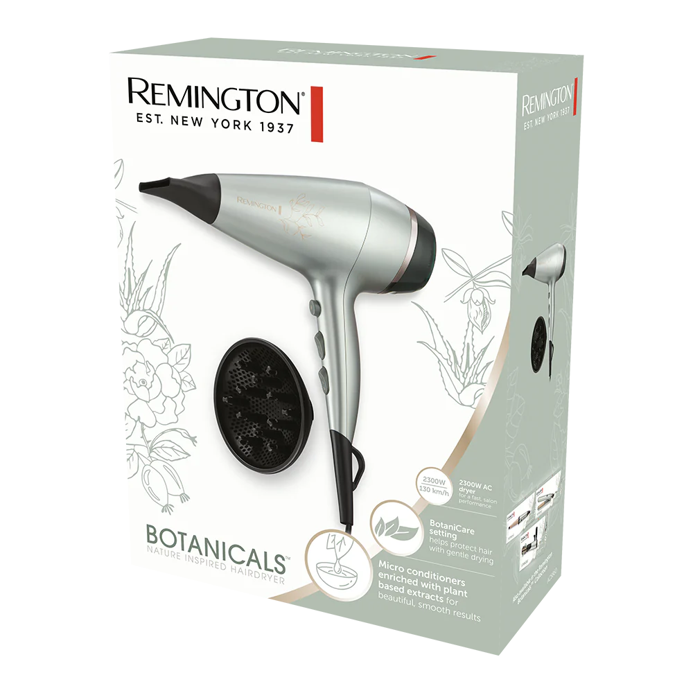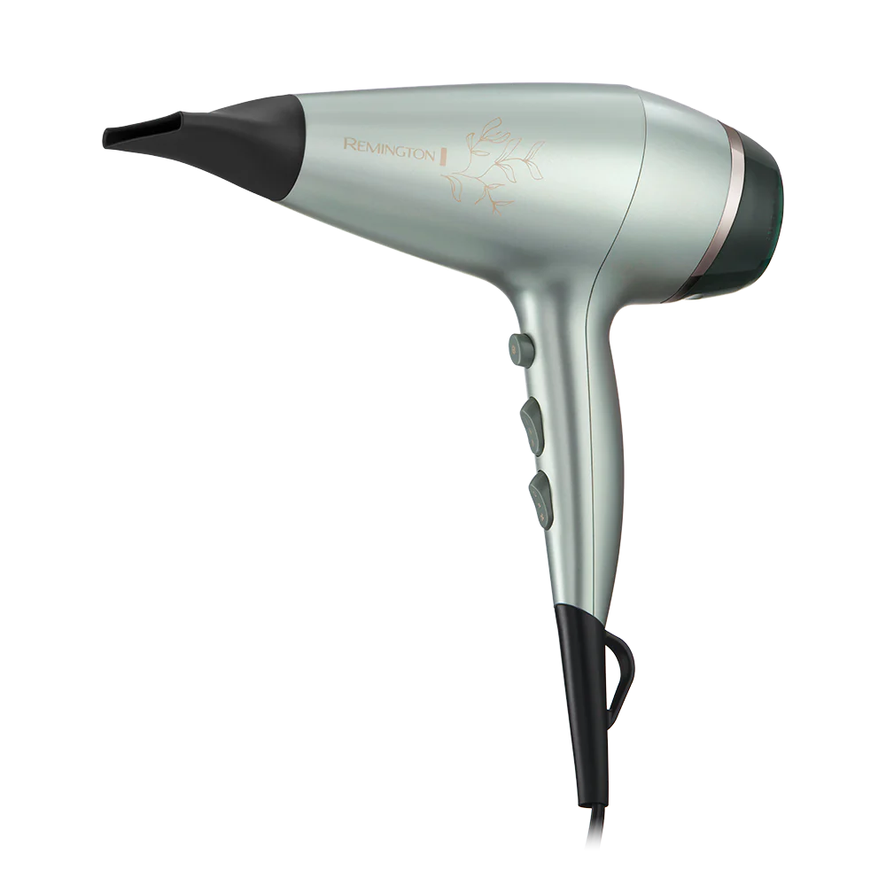 The Remington Botanicals™ Hairdryer harnesses beauty-enhancing elements found in nature with Aloe Vera, Jojoba and Rose Extract Micro-conditioners. These botanical micro conditioners are released into the air and care for each strand as it dries. Hair looks and feels great thanks to the hair-kind effects of blow-drying at a lower temperature* using the BotaniCare setting. Attachments such as a diffuser and super-slim 6mm concentrator help you to style your hair your way, for whichever version of yourself you want to be today.